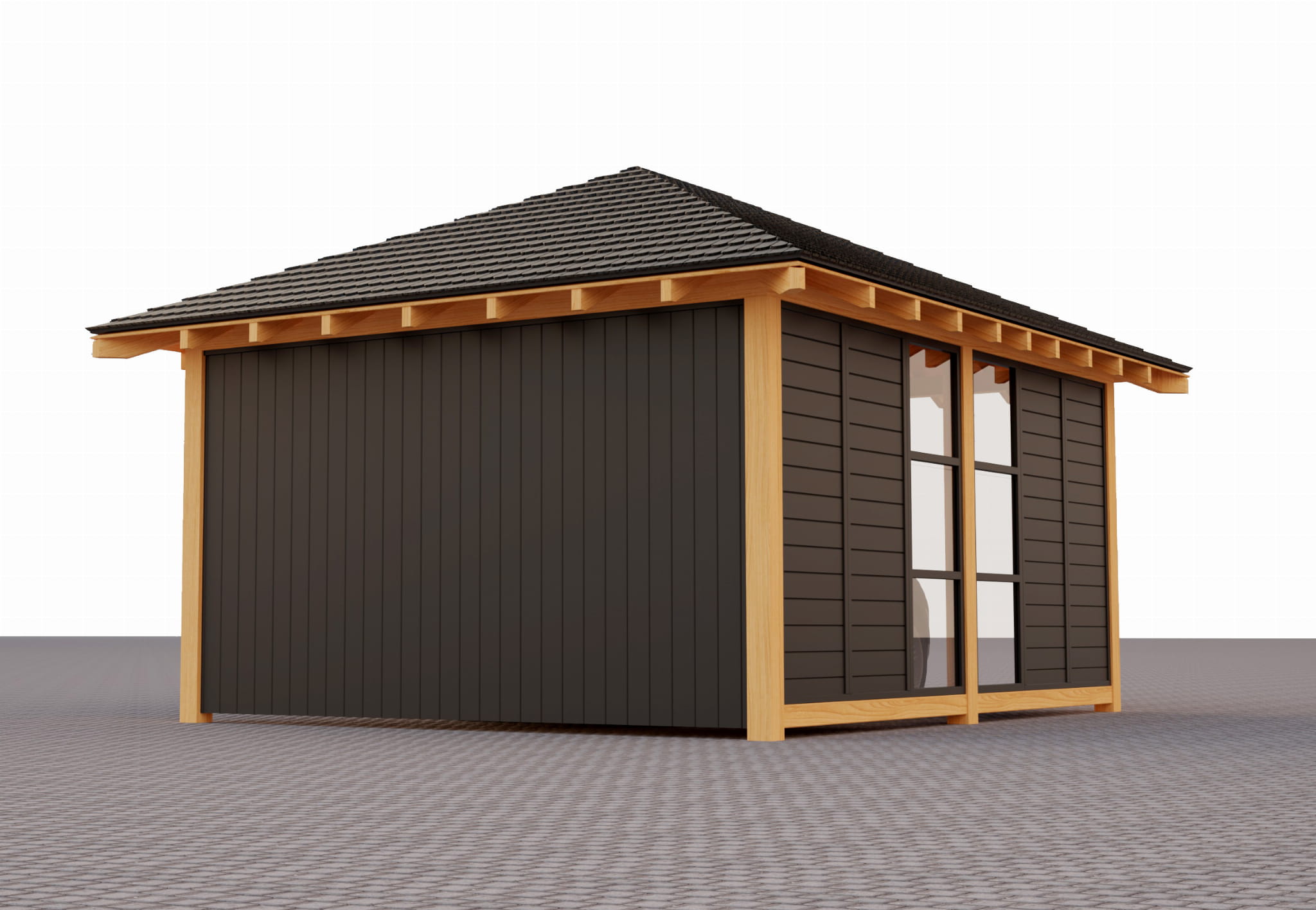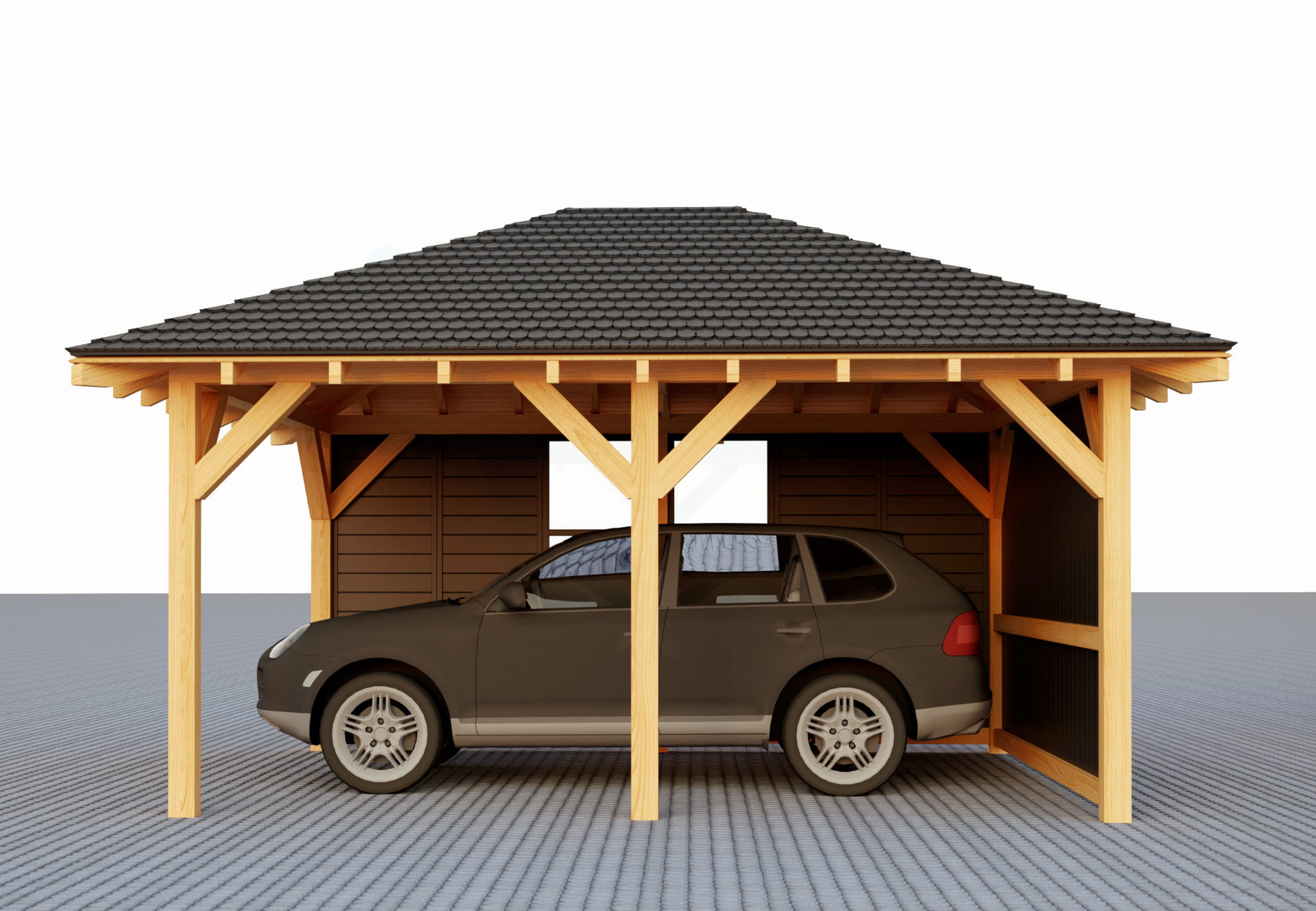 Holzunterstand 4×5 m mit Walmdach, Vollwand aus Nut- und Federbrettern sowie einem Glas­paneel mit Sicherheitsglas. Gefertigt aus KVH-Konstruktionsholz C24 – modern, langlebig und ideal als Carport oder Freizeitpavillon.