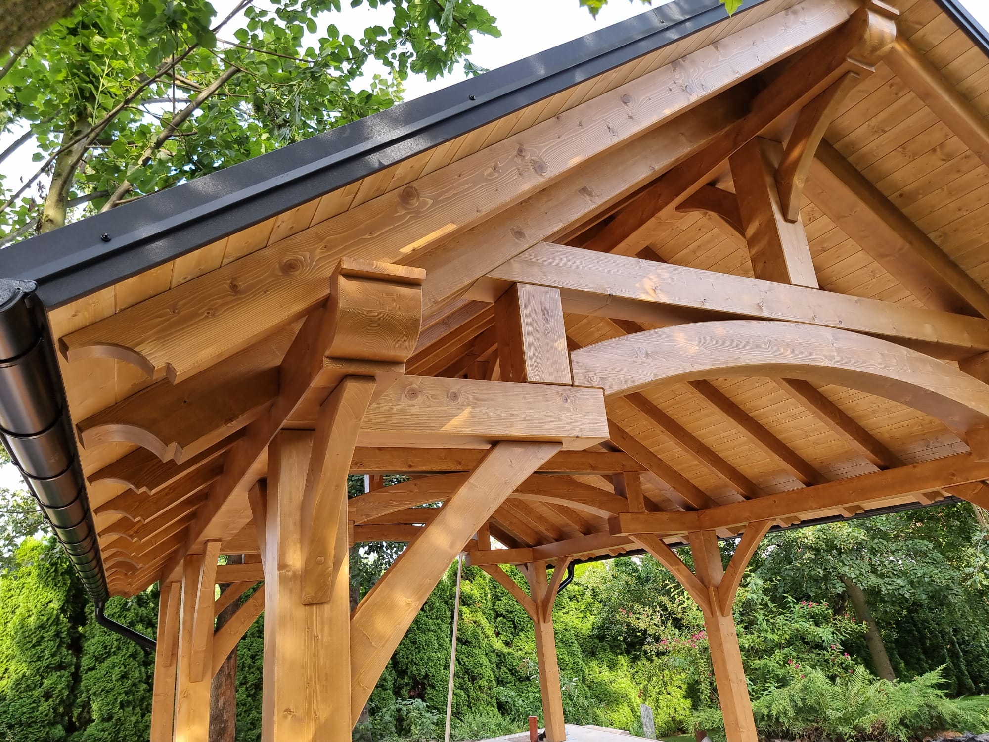 Durch dreimaliges Streichen und die Verwendung hochwertiger Farben behält der Holzunterstand lange sein ursprüngliches Aussehen. Dank dieser Methode ist die Holzoberfläche nicht nur geschützt, sondern sieht auch elegant und natürlich aus, wodurch sich der Unterstand perfekt in den Garten, auf die Terrasse oder in den Freizeitbereich einfügt. Regelmäßiges Streichen (in der Regel alle 4-5 Jahre) hält das Holz in einem hervorragenden Zustand und schützt es vor Verwitterung, sodass der Holzunterstand in einem ausgezeichneten Zustand bleibt und die Lackierung den Alterungsprozess des Holzes wirksam verzögert.